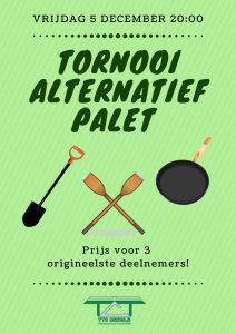 Op vrijdag 5 december om 20u organiseren we ons tornooi alternatief palet. Maak je eigen palet of gebruik een alternatief voorwerp als palet. Bekledingen met rubber zijn net zoals alle spelmateriaal uit andere racketsporten verboden. Er zijn prijzen voor de meest originele deelnemers!- Schrijf je in voor het nieuwe seizoen